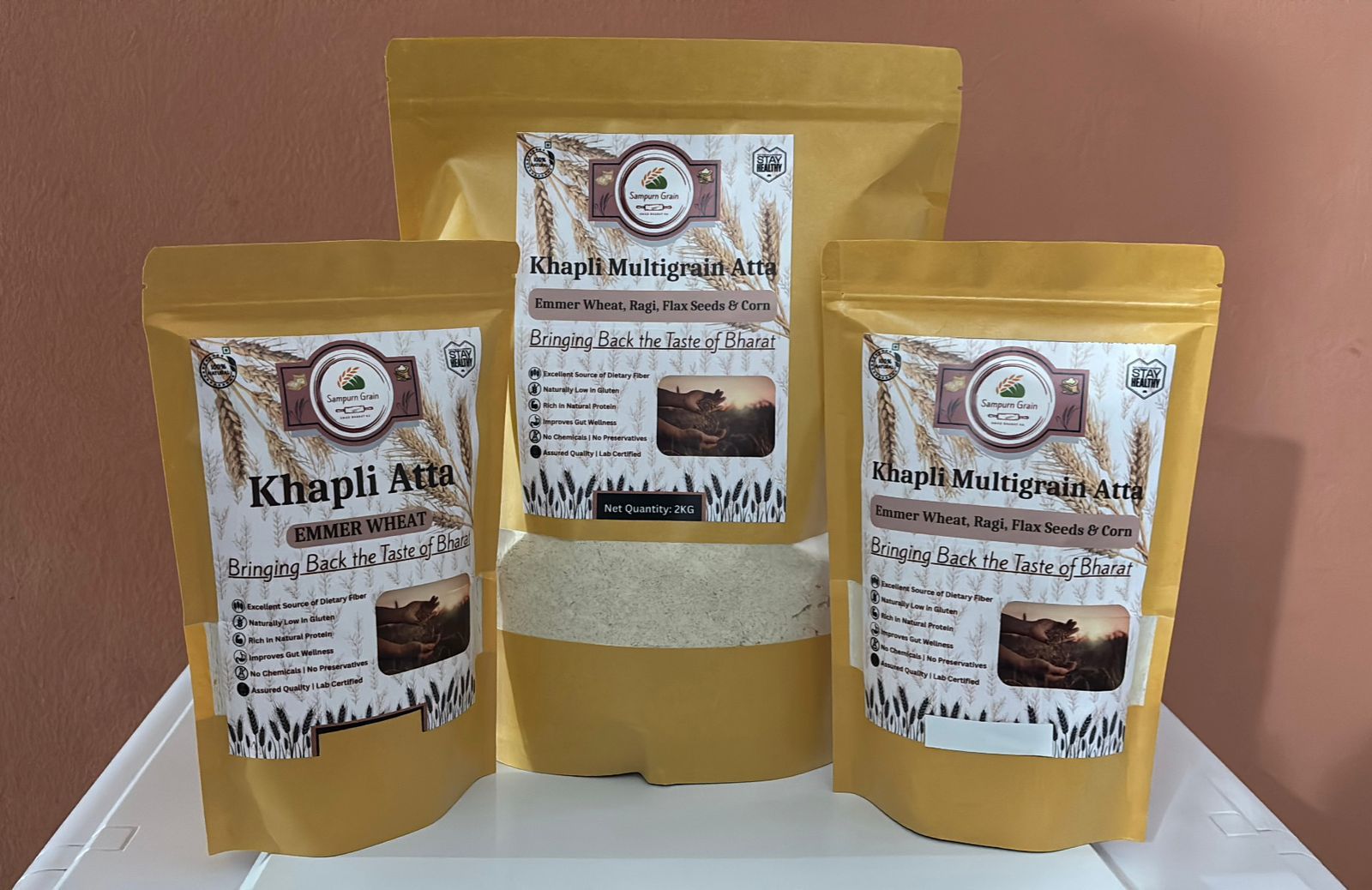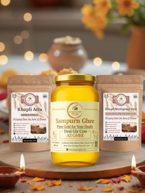 Sampurn Grain began with a simple mission — to bring back the forgotten goodness of ancient grains like Khapli (Emmer Wheat). What started as a small effort to provide our family with healthier, chemical-free alternatives soon grew into a trusted brand. Today, we proudly serve households across India that seek purity, nutrition and tradition in every pack of Khapli Atta, Khapli Multigrain Atta and A2 Gir Cow Desi Ghee.