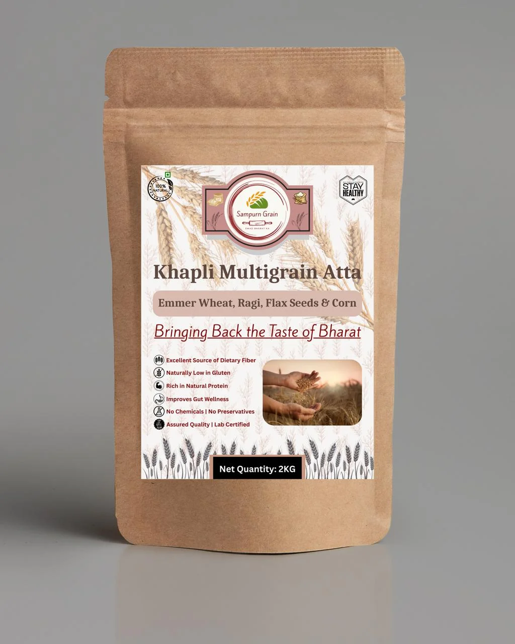 Multigrain Atta made with Emmer Wheat, Flax Seeds, Corn, and Ragi. Rich in fiber, protein, and minerals—boosts energy, supports heart health, and keeps you light yet full.